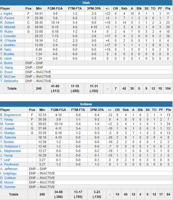 Battue par Indiana le 15 janvier, Utah, également bien aidé par les 18 points et 7 passes de Ricky Rubio, les 16 points de Jae Crowder et les 11 points et 10 passes de Joe Ingles, a depuis un bilan de 18-4 et reste sur 9 victoires d’affilée à l’extérieur. Rapidement mené au score en début de match, l’équipe de Quin Snyder s’est relancée avec un 28-12 sur les 8 dernières minutes du 1er quart-temps et était devant 54-44 à la pause. Indiana (12 passes décisives seulement contre 30 pour Utah) est revenu à moins de 10 points dans le 3ème quart mais son 38.6% (contre 51% aux tirs pour le Jazz) a été fatal.
