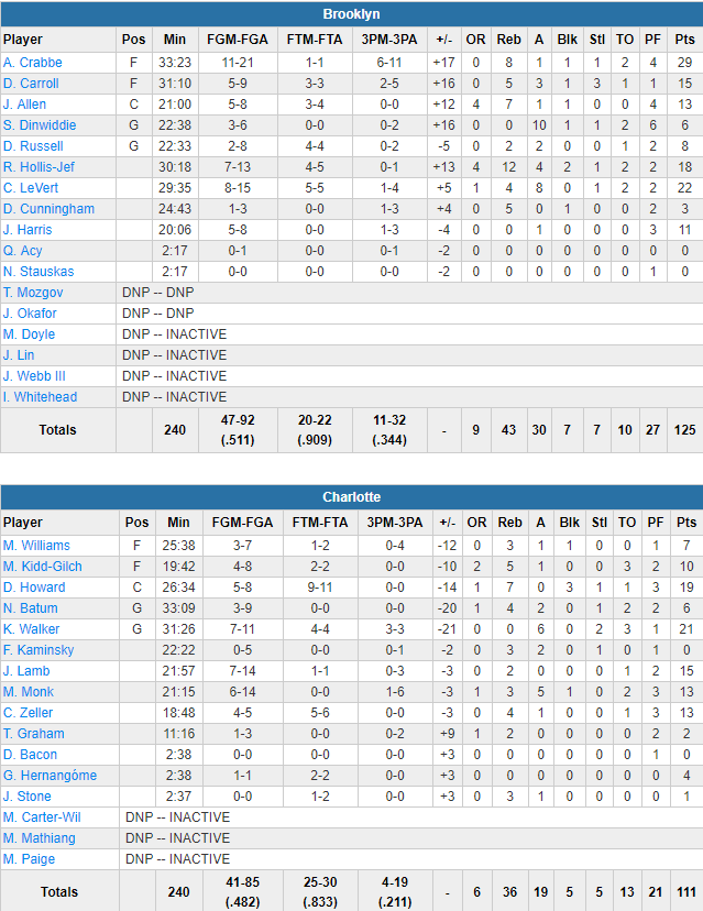 Brooklyn a été mené par un excellent Allen Crabbe, auteur de 29 points à 11/21 dont 6/11 à 3-pts, parfaitement aidé par les 22 points à 8/15 de Caris LeVert. DeMarre Carroll ajoute 15 points et Rondae Hollis-Jefferson compile 18 points et 12 rebonds en sortie de dribble. Les Nets shootent à 51.1% dont un 11/32 derrière l’arc et ne perdent que 10 ballons. Les Hornets sont un peu moins en réussite avec 48.2% dont un 4/19 à 3-pts. Kemba Walker marque 21 points à 7/11 et Dwight Howard ajoute 19 points à 5/8.