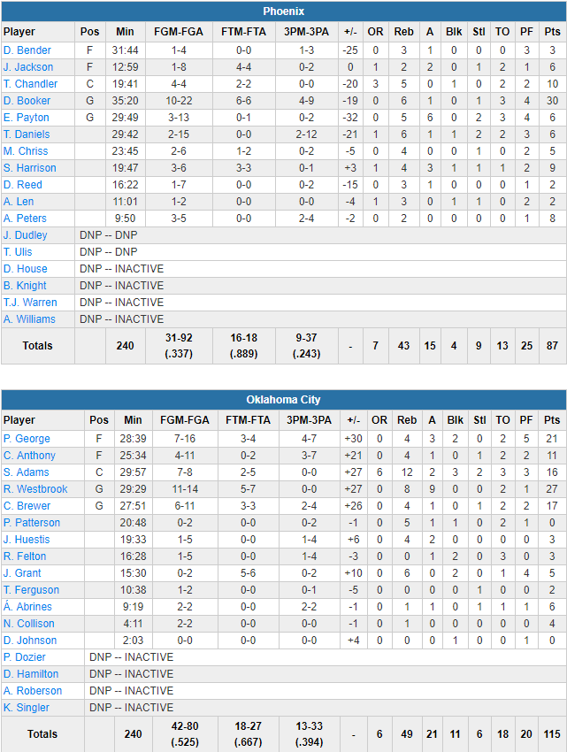 OKC a fait parler son collectif avec ses 5 titulaires à au moins 10 points mais aucun à plus de 30 minutes. Russell Westbrook signe 27 points à 11/14, 8 rebonds et 9 passes, Paul George ajoute 21 points et Corey Brewer 17 points. Le Thunder a shooté à 52.5% dont un 13/33 derrière l’arc alors que les Suns ont vécu un calvaire en attaque avec 33.7% et Devin Booker a été seul au moins puisqu’il est le seul à marquer plus de 10 points avec 30 unités à 10/22 dont 4/9 derrière l’arc.