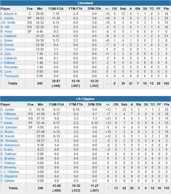 La série de 5 victoires des Cavs prend donc fin. LeBron James termine à 25 points à 11/20 (3/7 à 3-points), 9 rebonds, 6 passes, 3 contres et 2 interceptions. Mais aussi 5 ballons perdus et un petit 0/2 aux lancers-francs. Jordan Clarkson suit avec 21 points à 6/12 en 25 minutes et Larry Nance Jr. rend une nouvelle belle copie avec 16 points à 7/10 et 12 rebonds en 29 minutes. Mais les Cavs n’auront mené brièvement que de 3 points en tout début de match avant de laisser les Clippers prendre le contrôle.