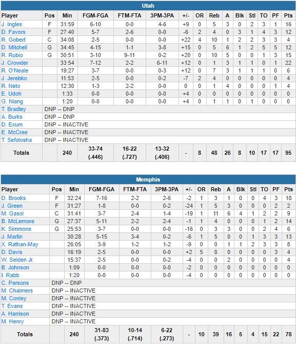 Cinquième victoire consécutive et 10ème de rang à l’extérieur pour le Jazz cette nuit à Memphis, 95-78. Jae Crowder a à l’occasion battu son record de points en saison (22 points, 6/11 à 3-points) contre des Grizzlies qui s’inclinent… pour la 16ème fois d’affilée. Un triste nouveau record de franchise.