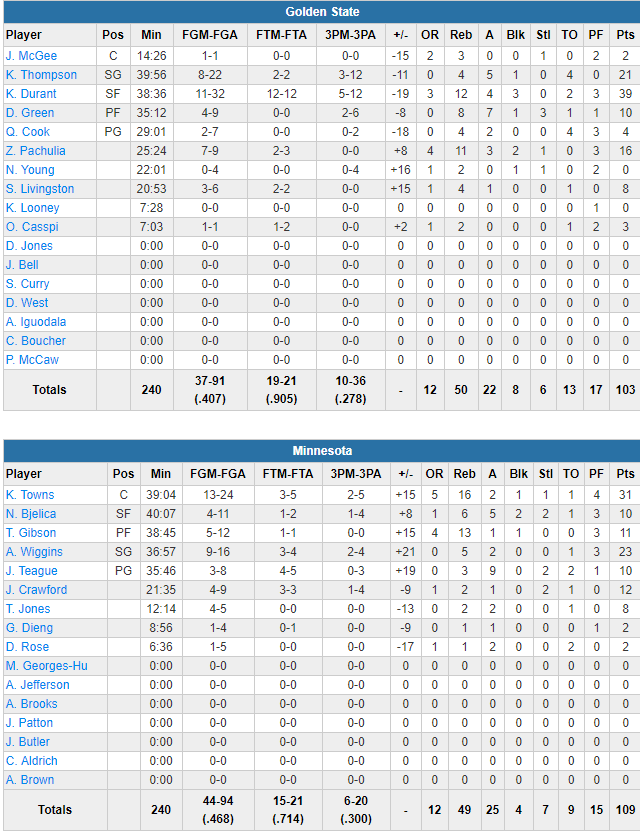Karl-Anthony Towns, décisif en fin de rencontre, est l’homme du match avec 31 points à 13/24, 16 rebonds et 2 passes, bien aidé par les 23 points d’Andrew Wiggins et le quatuor Nemanja Bjelica (10 points, 6 rebonds, 5 passes), Taj Gibson (11 points, 13 rebonds ), Jamal Crawford (12 points) et Jeff Teague (10 points et 9 passes). Les Wolves shootent à 46.8% dont un 6/20 à 3-pts alors que les Warriors ont cruellement manqué d’adresse, notamment en seconde mi-temps, limités à 41 points. Ils rentrent seulement 40.7% de leurs tirs dont un 10/36 à 3-pts. Si Kevin Durant plante 39 points, il shoote à 11/32 (12 rebonds, 4 passes et 3 contres) tandis que Klay Thompson arrose aussi avec 21 points mais à 8/22. Zaza Pachulia sort lui un excellent match avec 16 points à 7/9 et 11 rebonds.