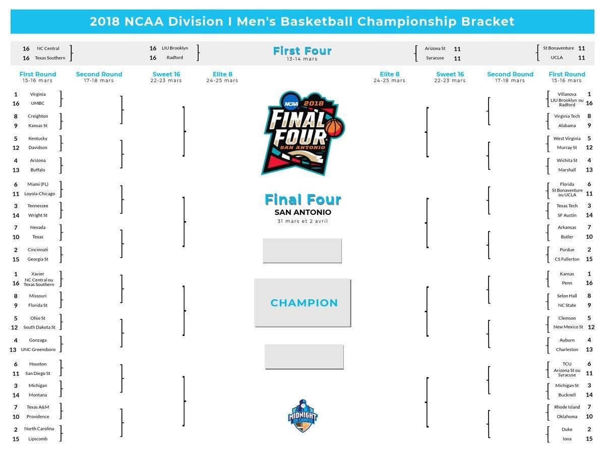 Pas de ranking pour finir cette chronique mais plutôt le bracket officiel de cette March Madness, édition 2017-2018. Il y a énormément de choses à dire sur les sélections, comme chaque année à vrai dire. La seule chose qu’on peut dire à l’heure actuelle, c’est que le NIT (tournoi annexe de la March Madness, qui récupère les plus grosses équipes non-sélectionnées) sera dantesque cette saison. On y retrouvera des équipes comme Saint Mary’s, qui a souvent trusté une place dans le Top 20 de l’AP Poll, Middle Tennessee (récemment #20 sur les trois derniers rankings), USC (le dauphin d’Arizona qui à cause de l’affaire du FBI, n’a pas été sélectionné) ou encore les favoris chez les Mid-Majors qui n’ont pas remporté leur tournoi de conférence.