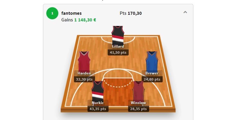 C’est fantomes qui l’emporte avec un 5 Harden, Brewer, Winslow, Nurkic et Lillard qui totalise 170.30 pts et rapporte 1148.3€.