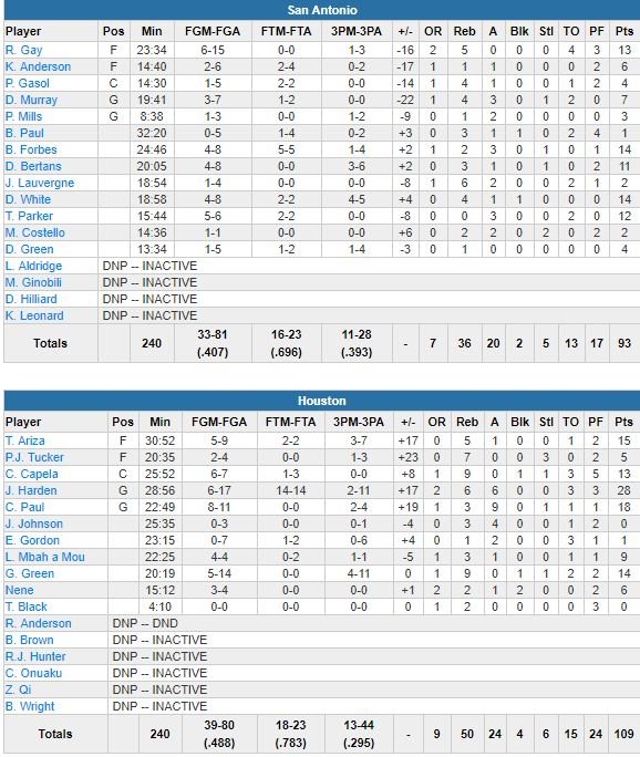 Le futur MVP et meilleur scoreur de la ligue termine à 6/17 aux tirs, 14/14 aux lancers-francs, 6 rebond et 6 passes en 28 minutes dans cette 53ème victoire de la saison pour Houston. Déjà devant de 13 points alors que Dejounte Murray venait de trouver un layup à 8 minutes de la fin, les Rockets ont ensuite vu Harden passer un 8-0 personnel aux Spurs pour démarrer un 16-4 collectif, faisant passer le score à 82-57 à 3 minutes et demi de la fin de la période et forçant un temps-mort de Gregg Popovich.