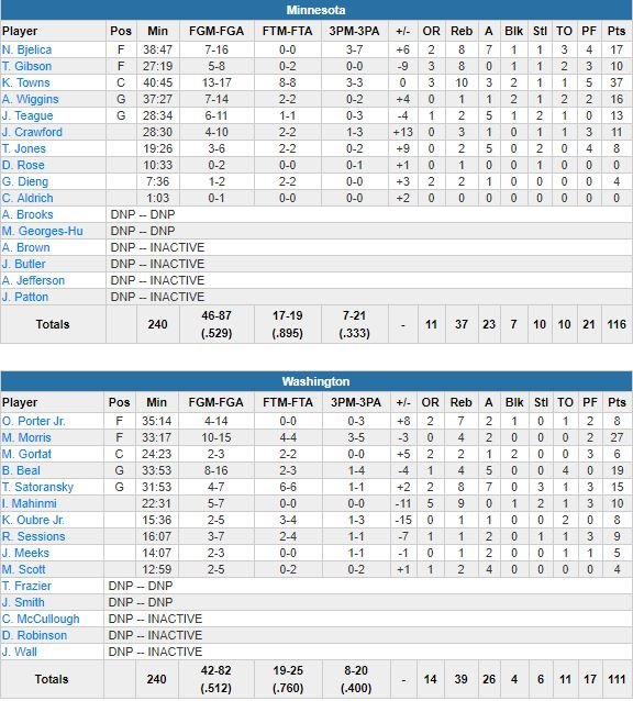 Sa défense a également été cruciale lorsque revenus à 114-111 et avec le ballon en main sur une remise en jeu à 15.8 secondes, les Wizards (27 points de Markieff Morris, season-high) ont perdu le ballon suite à une mauvaise passe de Bradley Beal (défendu par KAT), interceptée par Jeff Teague.