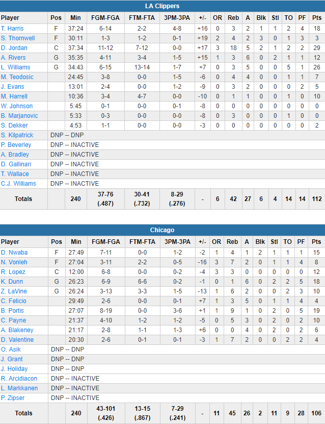 Avec une troisième victoire obtenue à Chicago cette nuit, les Clippers s’accrochent à leur 7ème place et sont bien partis pour faire les playoffs une 7ème saison d’affilée. DeAndre Jordan a été énorme avec 29 points à 11/12 et 18 rebonds dans ce match alors que Lou Williams s’est occupé du scoring avec 26 points, épaulé par Tobias Harris et ses 18 unités. L’équipe a pris le contrôle en fin de 3ème quart-temps en passant un 14-4 à ses adversaires pour prendre 14 points d’avance avant le dernier quart. Bobby Portis termine à 19 points et 9 rebonds pour les Bulls (sans Markkanen, touché au dos), Kris Dunn 18 points et 6 passes.