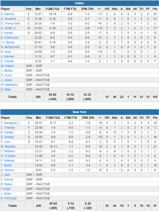 Dans le match des mal classés entre les Knicks et les Mavs, ce sont les Texans qui se sont facilement imposés au Madison Square Garden 110-97 à la faveur d’un gros 3ème acte, remporté 26-12. Dallas s’est appuyé sur son adresse extérieure avec 14 réussites. Harrison Barnes termine avec 30 points à 10/19 alors que Dennis Smith Jr. signe 17 points à 6/19. En face Michael Beasley est le meilleur scoreur avec 21 points alors que Tim Hardaway Jr. en marque 19. Frank Ntilikina était de retour sur le banc et il signe 4 points à 2/8 et 6 passes.
