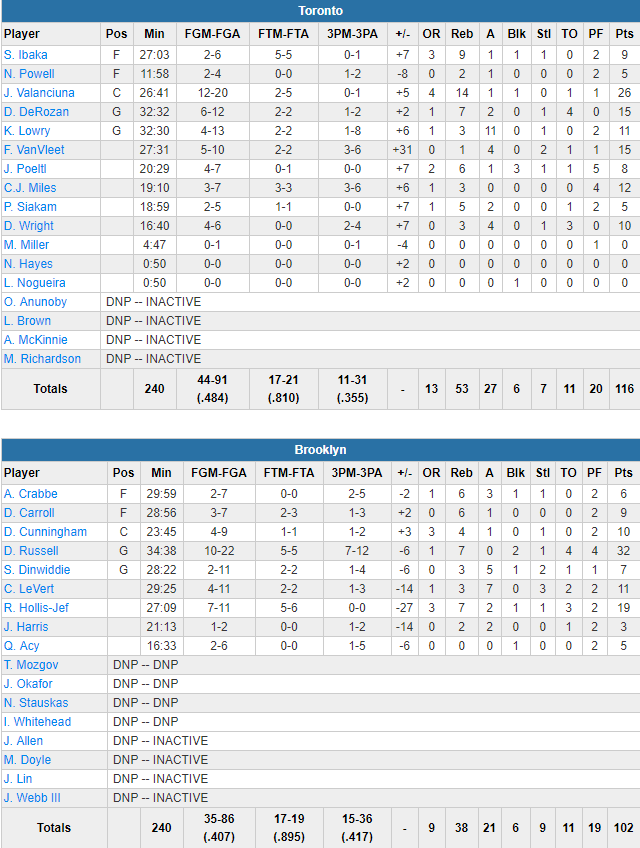 Toronto continue sa petite promenade à l’Est en s’imposant face aux Brooklyn Nets à la faveur d’une seconde mi-temps remporter 59-35 ! Jonas Valanciunas est l’homme du match avec 26 points et 14 rebonds alors que DeMar DeRozan marque seulement 15 points et Kyle Lowy 11. Le banc a de nouveau été performant avec 15 points de Fred VanVleet, 12 de CJ Miles et 10 de Delon Wright. En face D’Angelo Russell a tout tenté avec 32 points à 10/22 dont 7/15 derrière l’arc mais à part les 19 de Rondae Hollis-Jefferson, il a manqué d’aide après la pause.