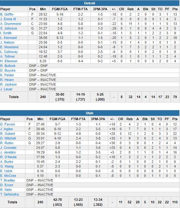 Rudy Gobert a terminé meilleur marqueur du Jazz dans ce massacre avec 22 points (9/12) et 12 rebonds. Cinq autres de ses coéquipiers signent au moins 10 points, dont Joe Ingles (17 points, 7 rebonds, 7 passes) et Jonas Jerebko (16 points, 8 rebonds). Donovan Mitchell a pu se permettre de lever le pied avec seulement 13 points à 4/10, 9 rebonds et 3 passes. Il a rentré un 3-points au buzzer du 3ème quart-temps pour donner 30 points d’avance aux siens, 81-51.