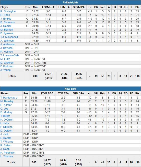 En retard de jusqu’à 13 points dans le 3ème quart, Philadelphie a passé un 20-6 aux Knicks de Michael Beasley (24 points et 13 rebonds), Courtney Lee (16 points), Trey Burke (16 points) et Kyle O’Quinn (15 points, 10 rebonds) dans les 5 dernières minutes du dernier quart pour aller chercher la victoire. Un run conclu par un 6-0 avec Simmons à la passe à chaque fois.