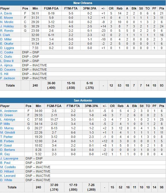 Menés par un Anthony Davis à 21 points (8/19) et 14 rebonds mais sorti pour 6 fautes après 36 minutes de jeu, les Pelicans (qui restaient sur 2 victoires face à San Antonio) ont joué quelques heures après avoir appris le décès de leur propriétaire, Tom Benson. Une défaite qui les fait glisser de 2 places au classement, de la 4ème à la 6ème place. New Orleans (24 points à 9/23, 8 rebonds, 7 passes et 3 contres pour Jrue Holiday) a effacé un déficit de 15 points pour revenir à 91-90 avant de perdre Davis quelques instants plus tard.