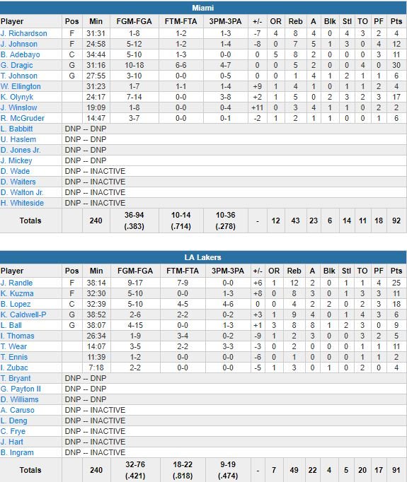 À noter : Los Angeles en tête 79-78, Miami a répondu par un 10-2 et les Lakers (25 points et 12 rebonds de Julius Randle, 18 points de Brook Lopez, 11 de Kuzma et Travis Wear) ont passé plus de 4 minutes sans marquer de panier. Lonzo Ball termine à 9 points à 4/15, 8 rebonds et 8 passes.