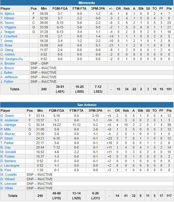 Cinq jours après être tombés à la 10ème place de l’Ouest, les Spurs restent pour le moment parfaits sur leur road trip de 6 matchs (3-0) et se maintiennent en 7ème position avec un bilan identique à Minnesota et Utah, respectivement 6ème et 5ème. Les Wolves ont pris les devant sur les 5 premières minutes du match en shootant à 78% et en limitant les locaux à 17%. Même après un temps-mort de Gregg Popovich, l’équipe voit directement Jeff Teague voler un ballon. Avant de finalement répondre sur un 16-4 porté par Manu Ginobili, Tony Parker et Pau Gasol entre le 1er et le 2ème quart-temps pour passer devant 29-26.