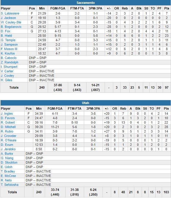 De’Aaron Fox a bien ramené les siens à 94 partout à 1’11 de la fin sur un lancer-franc suivi d’un dunk mais Joe Ingles, Rubio et Gobert ont chacun rentré 2 lancers pour reprendre 6 points d’avance (100-94) à 23 secondes de la fin. Garrett Temple a ensuite réussi un 3-points pour Sacramento mais encore une fois, Ingles (14 points, 7 rebonds et 9 passes) a rentré un lancer avant 2 points de Gobert pour clore le match.