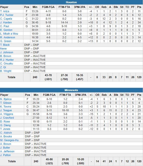 Bon test pour les Rockets la nuit dernière au Target Center de Minneapolis. Sur le parquet des Wolves, James Harden (34 points à 9/18, 14/14 aux lancers-francs, 4 rebonds, 12 passes) et ses coéquipiers sont repartis avec la victoire, 129-120, en résistant à un dernier effort des locaux. Une 26ème victoire en 28 matchs pour Houston, qui fait descendre Minnesota à la 8ème place.