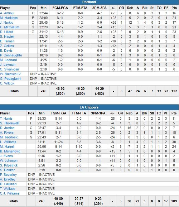 De passage à Los Angeles, les Blazers sont allés chercher une 13ème victoire consécutive sur le parquet des Clippers dimanche, 122-109. Damian Lillard (23 points à 6/31 en 31 minutes) et C.J. McCollum (21 points à 9/17, 5 rebonds, 3 passes) ont montré la voie à une équipe de Portland qui a compté 5 joueurs à au moins 10 points, avec un Maurice Harkless à 21 points (8/11, 5 rebonds), un Jusuf Nurkic à 17 points (8/18, 12 rebonds, 4 contres) et un Al-Farouq Aminu à 16 points (6/12, 8 rebonds, 6 passes).