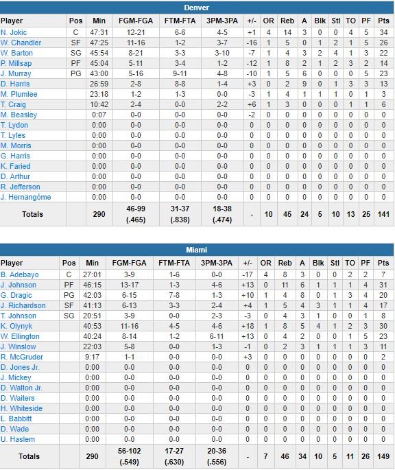 Après un quart-temps, Denver menait d’un point. À la mi-temps, Miami menait d’un point. Après trois quarts-temps, Miami était toujours devant d’un point. Au buzzer du 4ème, les deux équipes étaient à égalité. Et après 5 minutes supplémentaires… aussi. Il a ainsi fallu attendre 3 heures avant que le Heat de James Johnson (record en carrière avec 31 points), Kelly Olynyk (30 points en sortie de banc, 2ème remplaçant de l’histoire de son équipe à signer au moins 30 points) et Wayne Ellington (23 points) finisse par s’imposer 149-141. En battant au passage le record de points de la franchise sur un match.