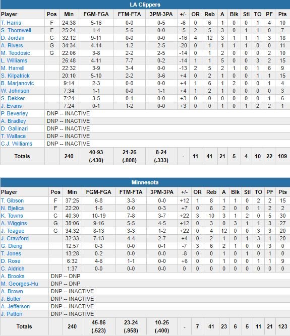 Jamal Crawford a ajouté 20 points pour son 38ème anniversaire et Taj Gibson 15 points. En face DeAndre Jordan signe 18 points et 12 rebonds, Lou Williams 15 points à 4/11 et Tobias Harris, malade, 10 points à 5/16. Dans ce match physique, aucune équipe n’a pris plus de 6 points d’avance avant le 3ème quart-temps et un 13-0 en faveur de Minnesota (52.3% de réussite contre 43%) pour mener 72-59.