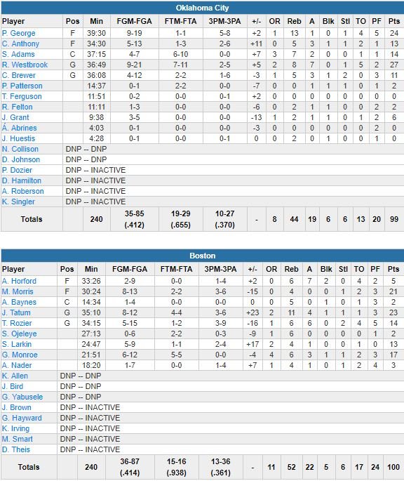 Boston passe devant 82-81 sur un nouveau tir primé signé Larkin en début de 4ème quart et le Thunder, après avoir manqué 15 de ses 21 premiers tirs à 3-points, en rentre un pour reprendre 4 points d’avance, 93-89. Boston revient à 99-97 sur un 3-points signé Rozier, avant de faire faute rapidement sur Carmelo Anthony à un peu plus de 8 secondes. L’ailier a manqué les deux, rebond Boston, temps-mort, shoot de Morris. Westbrook réussira à tenter un long 3-points au buzzer sur la dernière possession mais ce dernier sera trop court.