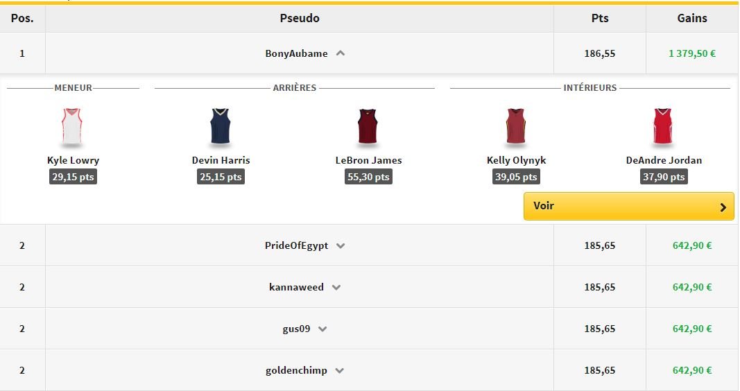 C’est BonyAubame qui l’emporte avec un 5 Lowry, Harris, James, Olynyk, Jordan qui totalise 186,55 pts et rapporte 1379,50€ !