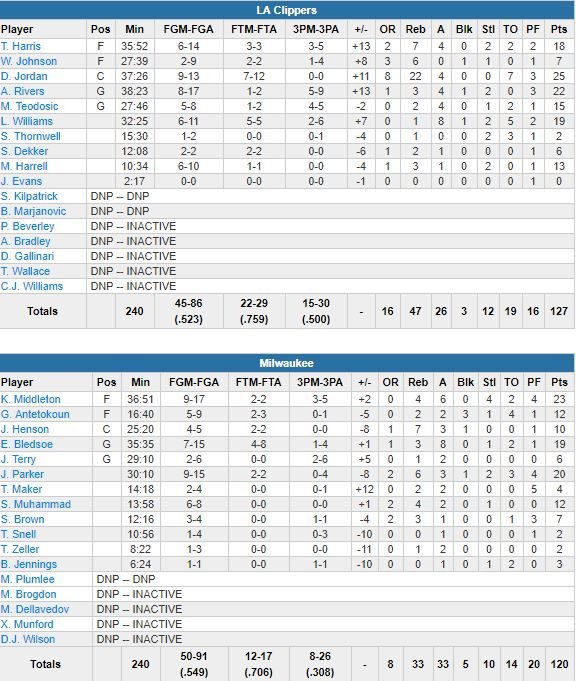 Devant 38-24 grâce à un 13-0 à 60% aux tirs dans le 1er quart (14 points et 10 rebonds de Jordan), les Clippers (19 points de Lou Williams, 18 points de Tobias Harris) se sont rassurés après avoir organisé une réunion réservée aux joueurs après leur défaite contre Minnesota mardi. Menés de 7 points à la pause, les Bucks ont pris jusqu’à 14 points de retard à la fin du 3ème quart, victimes d’une grosse adresse longue distance adverse (6/10 dans la période). Los Angeles a maintenu 10 points d’écart sur une bonne partie du dernier quart avant que Milwaukee ne revienne à 4 points à 1’14 sur un dunk après turnover des Clippers de Thon Maker. Rivers a ensuite rentré un 3-points difficile en fin de possession pour redonner 7 points d’avance aux visiteurs et les Bucks (23 points de Khris Middleton, 20 points de Jabari Parker en 30 minutes, plus gros temps de jeu de la saison pour lui) n’approcheront plus à moins de 5 points dans la dernière minute.