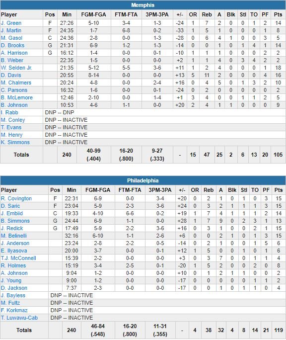 Embiid a inscrit la totalité de ses points en 1ère mi-temps pour permettre aux siens de mener 58-44 à la pause. Puis c’est dans le 3ème quart-temps que le match s’est transformé en possible carnage avec un 41-25 encaissé par les Grizzlies (18 points de Wayne Selden Jr.), menés 99-69 avant de jouer le dernier quart. Les Sixers (32 passes décisives) ont shooté à 64% sur la période, dont un 6/10 à 3-points.