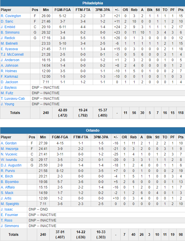 Brett Brown a même pu économiser ces joueurs dans ce match parfaitement maîtrisé. C’est Ersan Ilyasova qui termine meilleur marqueur avec 18 points à 7/11 alors que Joel Embiid compile 17 points à 6/11 et 9 rebonds en 20 minutes, et Robert Covington ajoute 15 points. Ben Simmons réussit lui un double-double sans les points puisqu’il compile 6 points à 3/4, 11 rebonds, 10 passes et 3 interceptions. Philly shoote à 47.2% dont un excellent 15/37 derrière l’arc en plus de 56 rebonds. Orlando est limité à 40.7% avec Rodney Purvis en meilleur marqueur, 19 points. Un seul titulaire atteint les 10 points, Aaron Gordon avec 10 à 4/15.