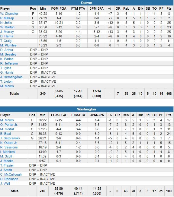 Paul Millsap a joué 25 minutes malgré une grippe, Devin Harris 28 en sortie de banc et l’équipe, en tête de 12 points à la pause, a vu son avance fondre jusqu’à seulement 2 points après avoir encaissé 7 tirs à 3-points dans le 3ème quart. Dominés 33-23 dans la période, les homme de Michael Malone se sont bien rattrapés avec un 30-24 sur les 12 dernières minutes. Bradley Beal a terminé à 24 points pour les Wizards mais ces derniers n’ont ni fait les stops ni rentré les shoots nécessaires en fin de match.