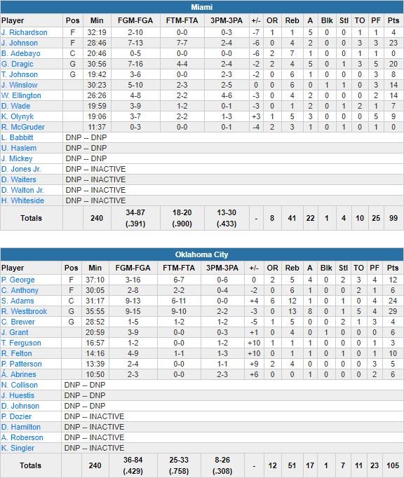 Miami, porté par 23 points de James Johnson et 20 e Goran Dragic, restait avant ce match sur 3 victoires. L’équipe menait 66-64 à la fin du 3ème quart-temps avant d’encaisser un 41-33 dans le dernier. OKC a pris 7 points d’avance 91-84 après un layup d’Adams plus la faute sans le lancer franc converti mais avec le rebond offensif et un panier mi-distance de Westbrook, puis Miami est revenu à 92-91 sur un 3-points de Johnson. Rendu de l’autre côté par Westbrook, à qui sera ensuite accordé un goaltending sur un layup pour le +6. Le Heat va réussir à réduire l’écart à 2 points dans la dernière minute, mais Westbrook a trouvé Adams pour le dunk sur un pick-and-roll pour le +4 (99-95) à 43 secondes. George a ensuite volé un ballon, rentré un layup et obtenu la faute. Son lancer à 38.2 secondes du buzzer a définitivement tué le match.