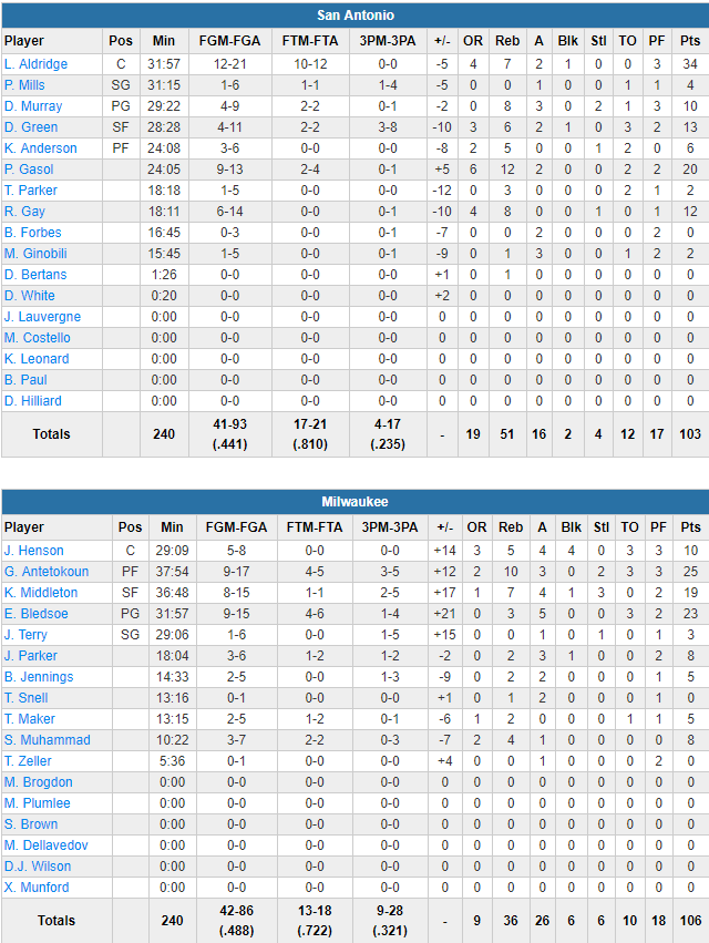 Milwaukee a fait la différence dans un 3ème quart où ils ont inscrit pas moins de 41 points. Ils se sont appuyés sur un trio Giannis Antetokounmpo (25 points à 9/16 et 10 rebonds), Eric Bledsoe (23 points à 9/15) et Khris Middleton (19 points à 8/15). Ils shootent à 48.8% sur le match et limitent leurs ballons perdus à 10. En face les Texans ont été moins adroits, avec notamment un vilain 4/17 à 3-pts. LaMarcus Aldridge a encore été énorme avec 34 points à 12/21 et 7 rebonds mais à l’exception de Pau Gasol et ses 20 points et 12 rebonds, derrière le supporting cast n’a pas été à la hauteur.