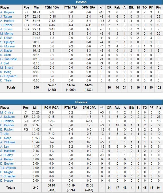 Al Horford a lui compilé 19 points, 9 rebonds et 7 passes alors qu’en face, Josh Jackson a imité Tatum avec 23 points, devant Tyler Ulis et ses 19 unités. Les Suns, sans Devin Booker (main) pour un 5ème match d’affilée s’inclinent pour la 27ème fois en 29 matchs. Tatum a inscrit 9 des 11 premiers points de son équipe, Jackson les 11 premiers de la sienne.