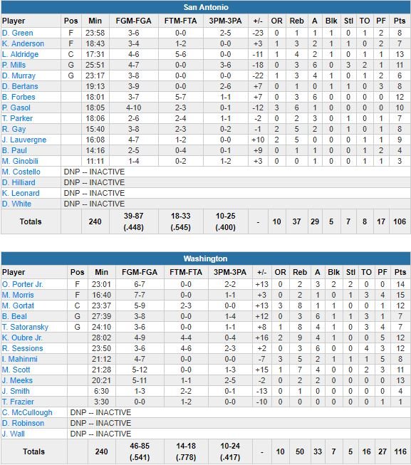 Avec 7 joueurs à au moins 10 points dont Markieff Morris et ses 15 points à 7/7 en seulement 17 minutes, les Wizards (61 points du banc !) ont mis fin à leur série de 3 défaites en battant les Spurs 116-106 cette nuit. Leur bilan sans John Wall est désormais de 15-11 et l’équipe reste à la 6ème place de la conférence Est, alors que le meneur ne devrait pas tarder à faire son retour.