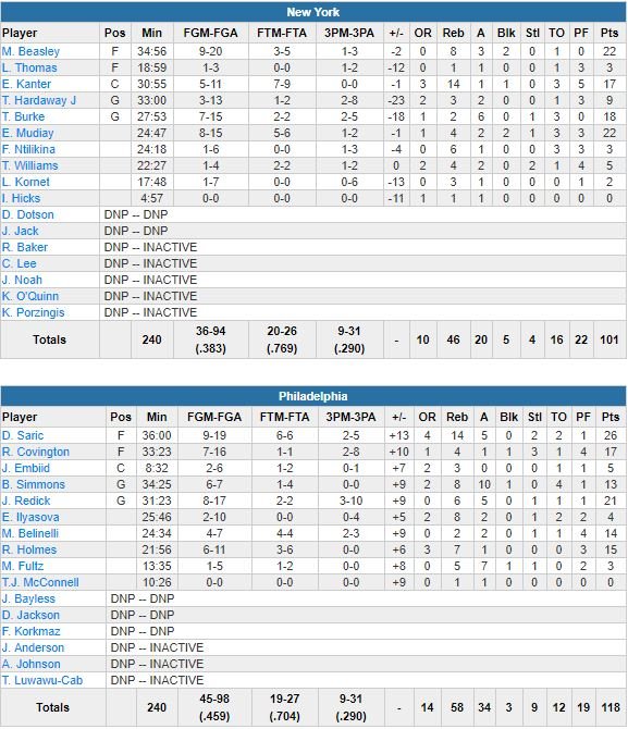 Les Knicks perdent eux pour la 4ème fois en 5 matchs malgré 22 points d’Emmanuel Mudiay et Michael Beasley. En retard de 4 points à la pause, New York comptait 14 points de retard à 2’42 de la fin du 3ème quart-temps, 91-77. Saric a ensuite fait en sorte dans le dernier quart que les Knicks ne représentent pas une menace. Embiid a joué 8 minutes pour 5 points et 3 rebonds.