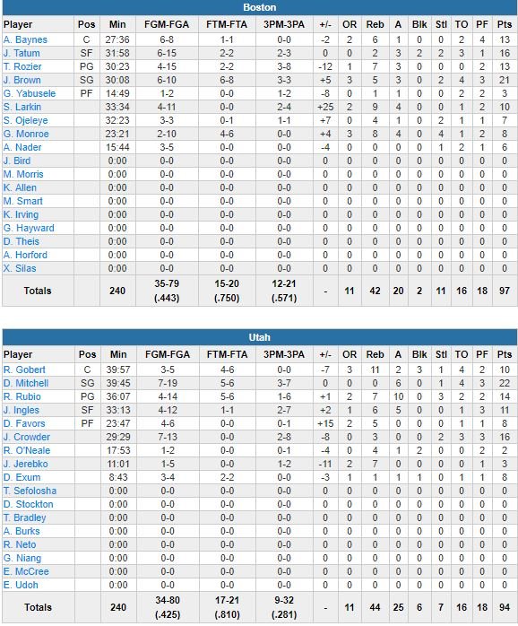 Crowder et Mitchell ont maintenu les locaux avec 2 layups mais Jayson Tatum a ensuite égalisé (94-94) sur un dunk à 1’09. Le rookie a ensuite sorti un contre clutch sur une tentative lointaine de Crowder à 17 secondes de la fin. Joe Ingles a récupéré le rebond mais raté sa chance près du panier, et Brad Stevens a pu profiter d’un temps-mort plein à 15 secondes. C’est ensuite sur une passe de Semi Ojeleye, entré en jeu à la place d’Aron Baynes, que Brown a mis dedans face au cercle derrière la ligne.