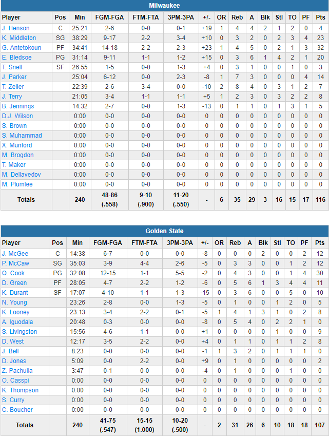 Si les champions enregistraient le retour de Kevin Durant, ce dernier a été expulsé en fin de première mi-temps. Draymond Green était aussi de retour mais les Warriors ont perdu Andre Iguodala, gêné par un genou douloureux. Pourtant cette fois les Californiens n’ont pas eu de soucis en attaque puisqu’ils shootent à 54.7% dont un 10/20 à 3-pts, avec 30 points de Quinn Cook, 12 de Patrick McCaw et JaVale McGee et seulement 10 de Kevin Durant et 11 de Draymond Green. Le souci c’est qu’ils ont sombré en défense et donné des munitions avec 19 ballons perdus et laissant les visiteurs shooter à 55.2% dont un 11/20 sur la ligne des lancers. Golden State laisse Milwaukee prendre également 5 rebonds offensifs de plus (7-2). Les Bucks ont été portés par un super trio Giannis Antetokounmpo (32 points à 14/18, 4 rebonds et 5 passes), Khris Middleton (23 points à 9/17) et Eric Bledsoe (20 points à 9/11 et 6 passes). Les hommes de Joe Prunty interceptent pas moins de 16 ballons.