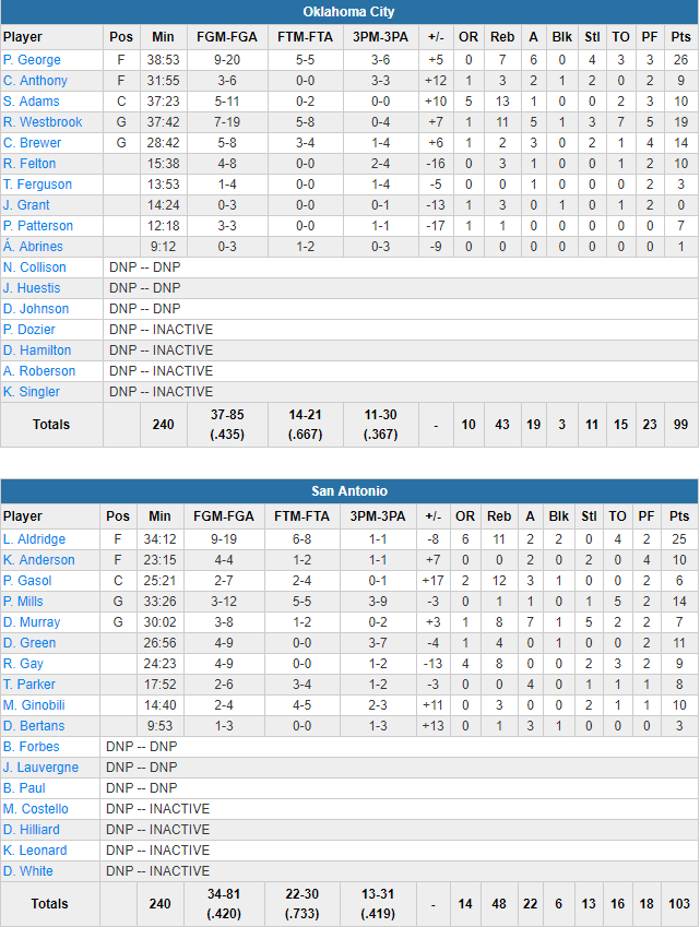 De retour, Aldridge a été encore une fois l’homme du match avec 25 points à 9/19, 11 rebonds, 2 passes et 2 contres, alors que ses coéquipiers ont été plutôt maladroits puisque les Spurs shootent à 42% mais rentrent 13 de leurs 31 tirs à 3-pts. Patty Mills ajoutent 14 points à 3/11, Danny Green, remplaçant, 11 points, et Manu Ginobili et Kyle Anderson 10 chacun. San Antonio réussit 22 lancers contre seulement 14 à OKC, une des clés avec les 14 rebonds offensifs texans. En face Paul George a retrouvé son adresse avec 26 points à 9/20, 7 rebonds, 6 passes et 4 interceptions, mais Russell Westbrook a été bien plus maladroit avec 19 points à 7/19 dont 0/4 à 3-pts (11 rebonds et 5 passes). Le meneur a raté deux 3-pts importants en fin de rencontre. Carmelo Anthony est plus discret avec 9 points à 3/6 dont 3/3 derrière l’arc.