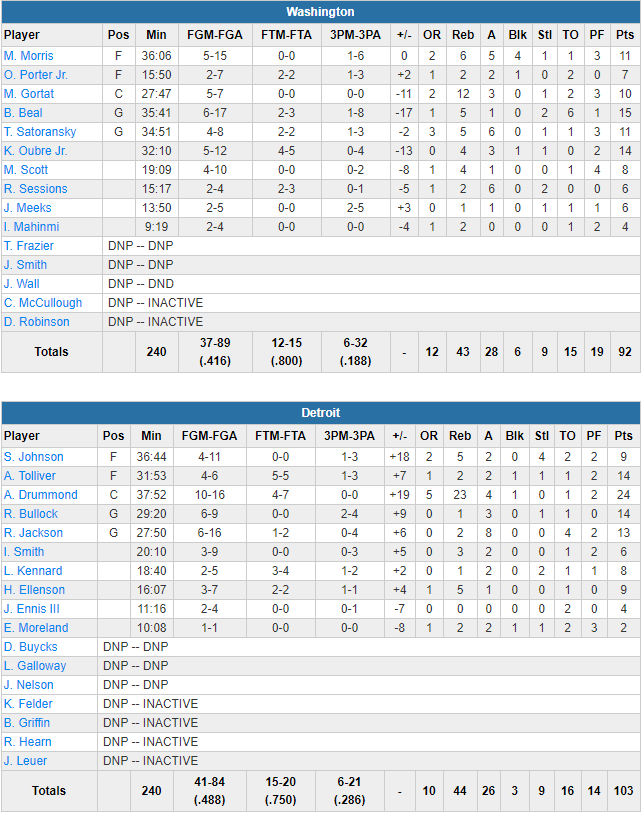 Detroit a été mené par un énorme Andre Drummond, auteur de 24 points à 10/16, 23 rebonds et 4 passes alors que Blake Griffin (cheville) était out. Anthony Tolliver et Reggie Bullock ajoutent 14 points et Reggie Jackson 13 points et 6 passes. Les Pistons rentrent 48.8% de leurs tirs contre seulement 41.6% aux visiteurs. Toujours privés de John Wall, Washington n’a pas vraiment pu compter sur Bradley Beal, limité à 15 points à 6/17, ni Markieff Morris qui shoote à 5/15 pour 11 points et Otto Porter, qui marque 7 points à 2/7 et qui a dû quitter ses coéquipiers en 3ème quart, touché à la cheville.