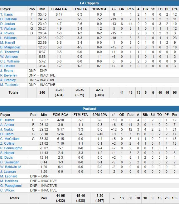 En visite à Portland, les Clippers ont perdu un premier match en 4 rencontres hier, 105-96. La faute à Jusuf Nurkic (21 points à 9/17, 12 rebonds, 3 passes, 4 contres et 2 interceptions) et Damian Lillard (17 points à 5/16, 7 rebonds et 11 passes) mais aussi… le rookie Zach Collins, sorti du banc pour 15 points après la blessure d’Ed Davis (cheville) dans le 3ème quart.
