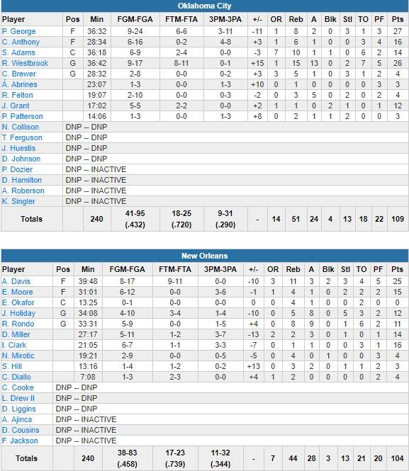 Les deux équipes restaient sur 3 défaites d’affilée avant ce match, qui a basculé dans le 2ème quart-temps lorsque le Thunder, mené de jusqu’à 10 points en fin de 1er quart (16-0 des Pelicans), a infligé un 33-22 pour monter jusqu’à +12. Paul George a marqué les 11 premiers points de la période et terminé à 27 points (9/24, 8 rebonds). Carmelo Anthony et Steven Adams ont ajouté 14 points chacun. Westbrook a inscrit 6 points avant la mi-temps pour donner 3 points d’avance aux siens, 53-50.