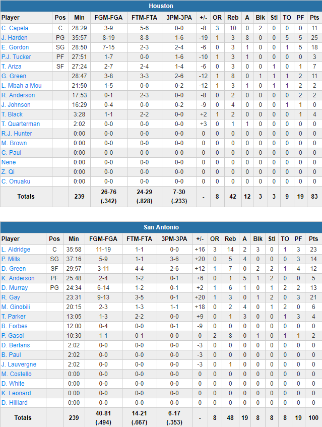 LaMarcus Aldridge sort encore un gros match avec 23 points à 11/19, 14 rebonds et 3 contres. Il a été bien aidé par le trio Rudy Gay, qui signe 21 points à 9/13 en sortie de banc, et Patty Mills (14 points à 5/9) et Dejounte Murray (13 points et 6 rebonds). Les Spurs shootent surtout à 50% alors que les Rockets ont vécu un calvaire en attaque avec un horrible 34.2% dont un 7/30 à 3-pts. Chris Paul était out mais James Harden n’a pas réussi à porter les siens avec 25 points à 8/19, 8 passes et 5 ballons perdus. Eric Gordon marque 18 points et Gerald Green 11.