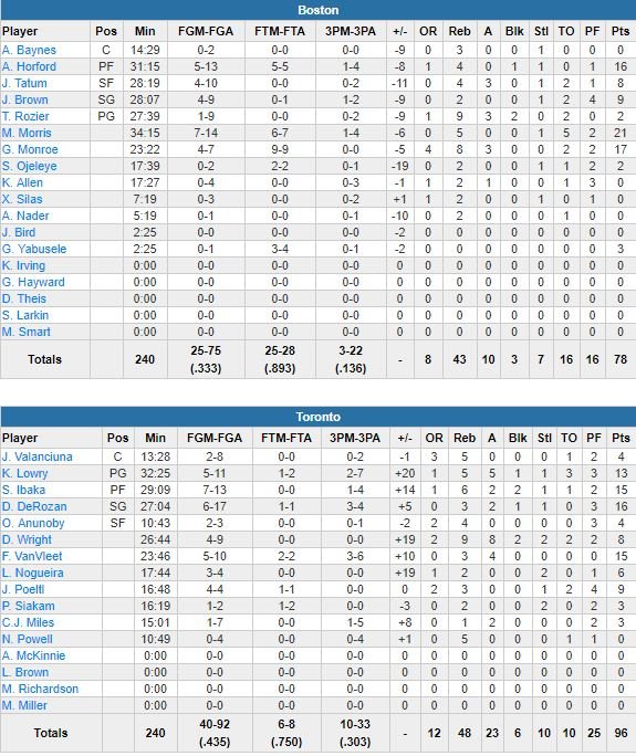 Le match a basculé dans le 2ème quart-temps quand Boston a perdu 9 ballons pour 17 points de Toronto, passé devant 43-33 derrière 6 points de Delon Wright. Les Celtics ont totalisé plus de turnovers (14) que de paniers marqués (13) en 1ère mi-temps. Leur adresse n’est pas réapparue au retour des vestiaires, avec un 5/19 aux tirs pendant que DeRozan marquait 8 points dans la période et que les Raptors s’envolaient 67-53 avant le 4ème quart, remporté 29-25 par les locaux.