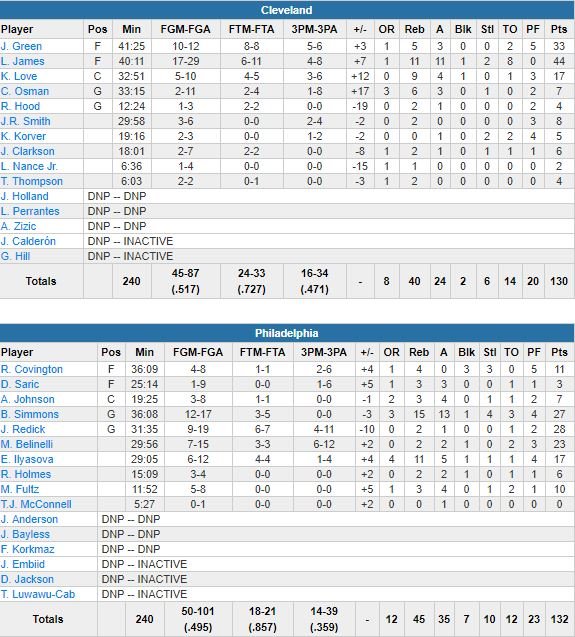 Les Cavs (49-31) n’auront mené très brièvement que de 5 points en début de match avant de prendre jusqu’à 30 points de retard (78 points encaissés à la mi-temps) puis de recoller au score dans les dernières minutes, sans jamais réussir à reprendre l’avantage. Avec ce succès, Philadelphie (49-30) s’empare de la 3ème place de la conférence Est.