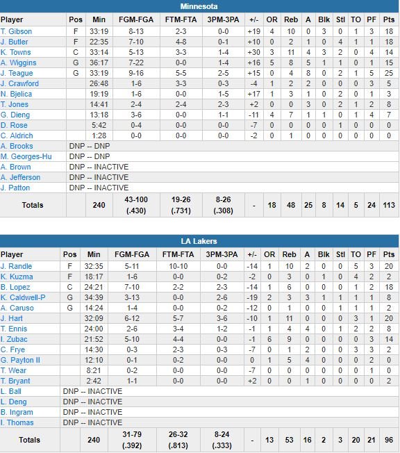 Minnesota a démarré le 3ème quart sur un 16-6 et a repris la tête 67-64 sur 2 points de Butler. Teague, Andrew Wiggins et Towns ont chacun rentré au moins un 3-points pour donner 8 points d’avance aux Wolves à 3’25. Towns a ensuite conclu un 11-2 sur un layup pour le +10 (78-68) à 2’12 de la fin du 3ème. Finalement, Josh Hart a ramené les locaux à 80-73 à 3-points au buzzer mais son équipe ne survivra pas au 33-23 encaissé dans le dernier quart (62-38 encaissé en seconde mi-temps). Les Wolves ont pris jusqu’à 20 points d’avance avant de tuer le match sur un 6-0 alors que les Lakers étaient revenus à 13 points.