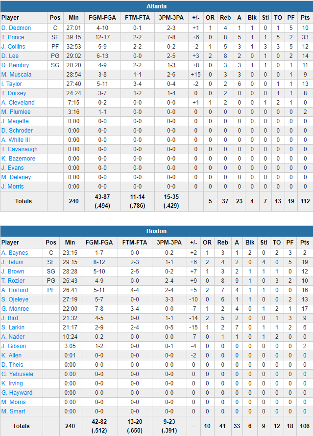 Taurean Prince continue sa belle fin de saison avec un très gros match : 33 points à 12/17 dont 7/8 à 3-pts en plus de 8 rebonds et 5 passes. 5 autres Hawks marquent entre 10 et 14 points. L’équipe shoote à 50% dont un superbe 15/35 derrière l’arc en ne perdant que 13 ballons. Ils ont notamment inscrits 63 points en seconde mi-temps, dont 36 en dernier quart. Boston shoote pourtant à 51.9% mais rentre seulement 9 de ses 23 tentatives à 3-pts. Jayson Tatum inscrit 19 points, Greg Monroe 17 et Al Horford 16.