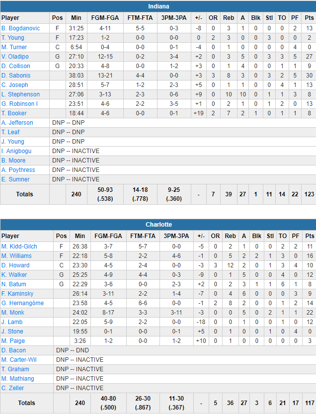 Domantas Saborinis et Vitor Oladipo ont été énormes avec respectivement 30 points à 13/21 et 27 points à 12/15. Indiana shoote à 53.8% sur le match face à une défense de Charlotte aux abonnées absentes. Ces derniers ont fait tourner avec un Malik Monk qui en a encore une fois profité avec 22 points à 8/17 mais 3/11 à 3-pts en 24 minutes. Aucun titulaire ne joue plus de 27 minutes.