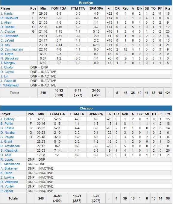 Bobby Portis a marqué 13 de ses 18 points (2ème meilleur marqueur de son équipe derrière Sean Kilpatrick et ses 20 unités) dans le 1er quart pour aider les Bulls à se remettre d’un 16-7 encaissé d’entrée mais un 14-1 encaissé dans le 2ème quart a ensuite permis aux Nets de recreuser l’écart, 61-47 à 1’11 de la mi-temps. Crabbe a ensuite rentré 4 des 9 tirs à 3-points de son équipe dans le 3ème quart et Brooklyn est monté jusqu’à +20, sans être inquiété.