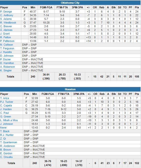 Un step-back de Chris Paul (17 points à 6/15, 4 rebonds, 9 passes) suivi d’un shoot réussi de Gerald Green (14 points à 5/10) ont placé Houston devant 92-91 à 7’09 de la fin. Westbrook a marqué les 5 points suivants, initiant le fameux 11-0 d’OKC, devant de 10 points (102-92) à 4 minutes de la fin. Durant ce run d’environ 4 minutes, Houston a raté 7 tirs, a perdu 3 ballons et s’est fait contrer 3 tirs. Les Rockets se sont réveillés avec un 5-0 dans la dernière minute pour revenir à 5 points mais 2 lancers-francs de George ont scellé la victoire du Thunder, également aidé par les 22 points (dont 3 des 10 trois-points du Thunder) de Carmelo Anthony. James Harden (1/5, 4 fautes et 1 ballon perdu dans le 4ème quart) a lui terminé à 26 points à 7/16, 4 rebonds et 9 passes en 36 minutes.