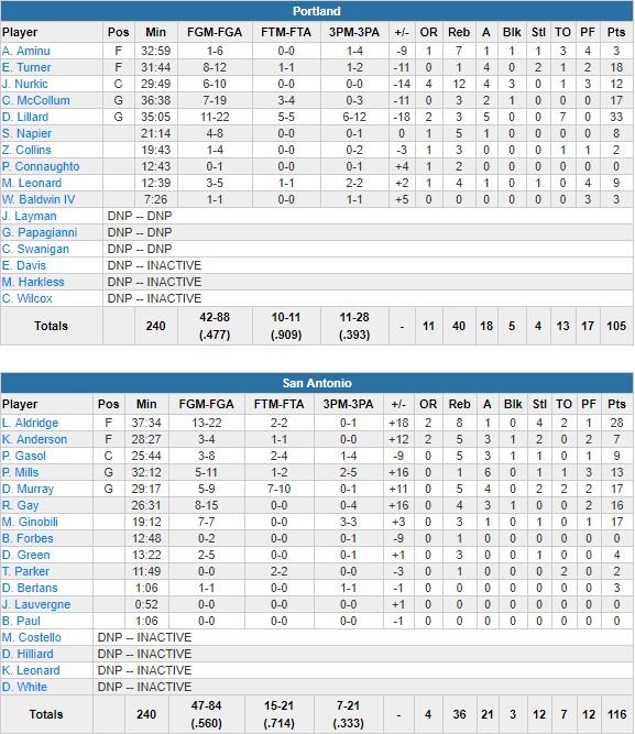 Troisième défaite d’affilée pour les Blazer et premier succès en 3 matchs pour San Antonio, vainqueur 116-105 de Damian Lillard (33 points à 11/22 et 6/12 à 3-points, 3 rebonds, 5 passes) & Co à l’AT&T Center cette nuit. LaMarcus Aldridge a montré la voie avec 28 points à 13/22, 8 rebonds et 4 interceptions (record en carrière) et 4 de ses coéquipiers ont terminé à au moins 13 points, dont Dejounte Murray et ses 17 points à 5/9, 5 rebonds et 4 passes.