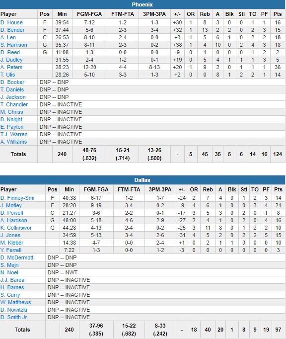 Auteur de 36 points à 12/20 et 9 rebonds, Peters (54ème choix de la draft après 4 saisons à Valparaiso) a pourtant raté ses 4 derniers tirs. De fatigue après 28 minutes de jeu. Que ce soit chez les Suns ou chez les Mavs dans ce match, 8 joueurs manquaient à l’appel de chaque côté.